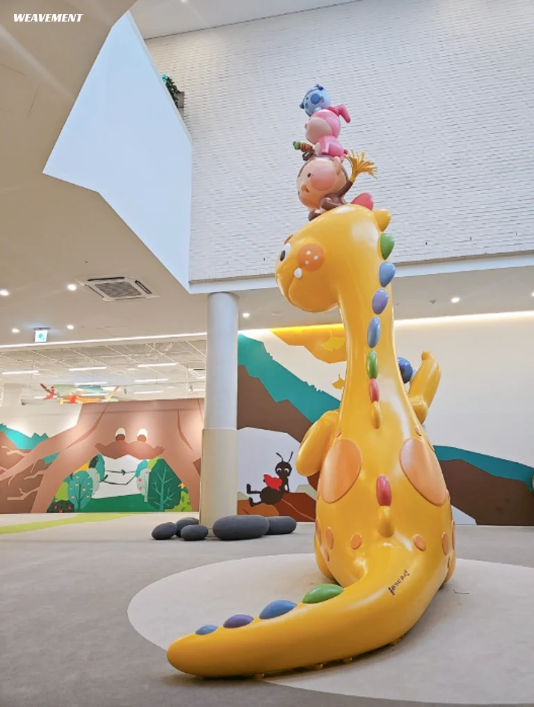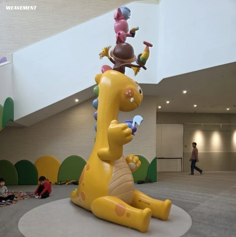 원주시 어린이체험공간 놀비숲에 설치된 '놀롱이와 친구들'입니다. 장기 전시용으로 제작되어 내구성 높은 FRP 소재가 선택되었습니다. FRP 캐릭터 조형물은 도색 후 반광 코팅으로 깔끔하게 마감하였습니다. 메인 캐릭터와 서브 캐릭터 3종을 결합하여 원주 놀비숲을 상징하는 총 높이 약 4.5m의 대형 캐릭터 조형물이 완성되었습니다.